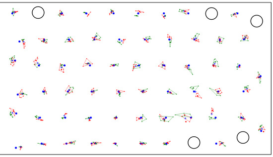 Calibration points with accompanying gaze data samples as captured with a horizontally moving target. Missing points marked with circles.