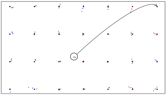 Validation points with left (green) and right (red) eye averages of samples per point. The average be-tween eyes is indicated with a blue +. A point where the participant was distracted, is also shown.