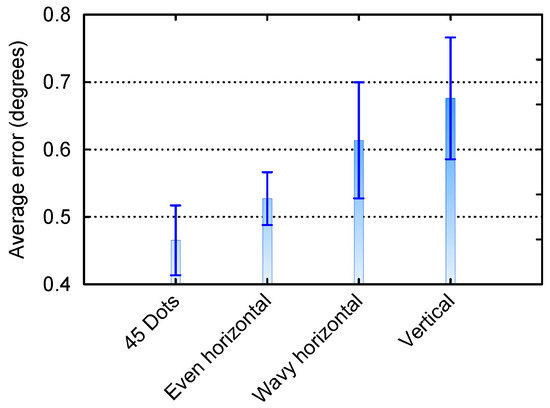 Average error over participants and val-idation targets for four calibration routines. The vertical bars denote the 95% confidence intervals of the means.