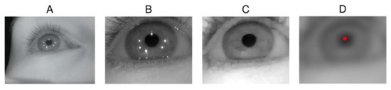 Different preprocessed stages are used in different parts of the algorithms: the eye stability estimator uses the filtered image (Figure 2D); the pupil localization uses the opened image (C) and estimated pupil center; and the glint localization uses the cropped and opened images (B and C) together with the estimated pupil center.