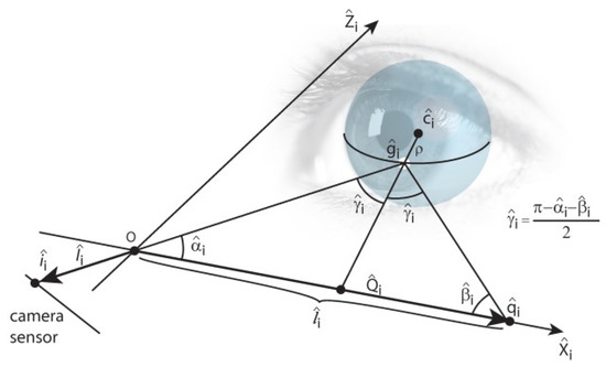 Computing the cornea center from the detected glints, Eq. (10), is done using a scheme that is presented by Hen-nessey et al. (2006) and Shih and Liu (2004) and explained here in brief. It is based on the law of reflection, according to which the LED source, its reflection from the corneal surface, the cornea center, camera’s optical center, and the image of the reflection on the camera’s image plane are all co-planar. Hence, we can form a glint specific auxiliary coordinate system whose origin is at the optical center of the camera, as described in Figure 4.