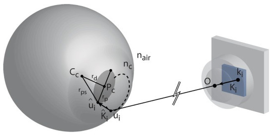 The ray tracing method for estimating the pupil center. Pc is the pupil center, Cc is the cornea center, ûi is a point in the pupil perimeter, ui is a point in the corneal surface, K̂i is a unit vector between these, ki is the image point of ui , Ki is the unit vector between these, and O de-notes the optical center. The ray Ki refracts at the cor-neal surface because the refractive index of the cornea is nc > 1. The figure is adapted from Hennessey et al. (2006).