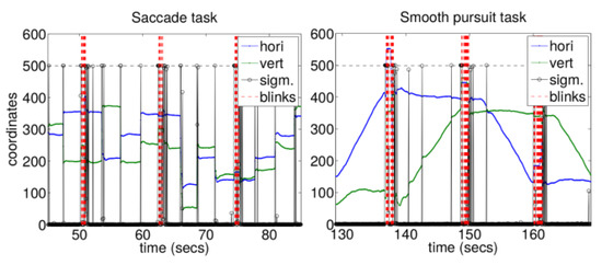 Illustrative examples of the estimated gaze tracking signal, in the scene camera coordinates. Blue and green lines show the horizontal and vertical coordi-nates. Estimated blinks are shown as vertical red dotted lines. The black curve shows the sigmoid values of Eq. (2), scaled between 0 and 500 which is indicated as a dashed vertical line. Left panel is from the saccade task and right panel from the smooth pursuit task.