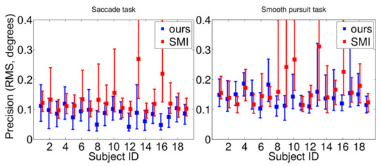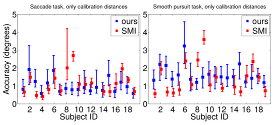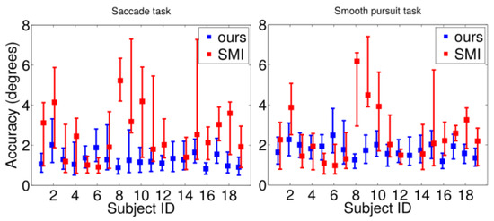 . Our tracker seems to outperform the SMI system with most of the subjects. In addition, the performance of the presented system stays relatively equal for each subject, whereas SMI’s varies a lot. The SMI’s accuracies of ID13 are out of figure range, with its median values being 19 and 17 degrees for saccade and smooth pursuit tasks. In our gaze tracker, subject ID06 performs poorly due to mascara.