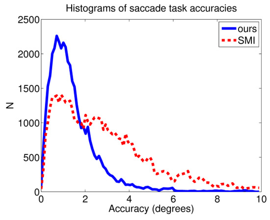 As a final comparison between the two systems, Figure 17 shows the histograms of accuracies in the saccade task, excluding the anomalous cases. Accuracy values for the presented systems are clearly concentrated around lower error values, whereas the distribution of the SMI device is wider, including values with larger errors.