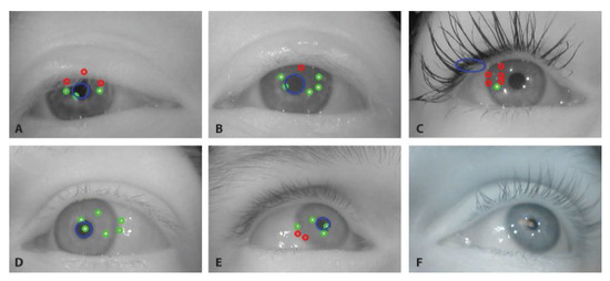 Examples of challenging issues. Green dots in-dicate identified glints, red dots indicate glints inferred as non-visible (at locations where the posterior glint model expects them), blue circle depicts the located pupil ellipse. (A,B) simultaneous frames for the left and right eyes, where the eyelid and eyelashes occlude some of the glints and part of the pupil. (C) Heavy mascara corrupt-ing the pupil location and “dragging" the glint grid to the left. (D) additional false reflections on the scleral surface (E) missing glints. (F) an example of a reflection of a win-dow.