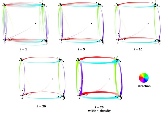 The square scanpath illustrates the inherent visual clutter of gaze recordings. While the target presented a small dot appearing at the exact same locations, the fixations were detected at quite different positions. A few iterations of fixation clustering make it possible to bring adjacent fixations together (Figure 2), and saccade bundling merges the saccades of the same direction and orientation (Figure 3). After applying these two steps, we can easily distinguish mutual transitions between corners. By separating the edges of different directions, the flow direction map of bundled data can also be used to interpret the data (Figure 4). While the overlapping saccades of the raw data canceled the flow of the opposite orientation (Figure 1, bottom right), the bundled layout has eight clearly visible flows corresponding to saccade bundles: four horizontal (Figure 4, left) and four vertical (Figure 4, right).
