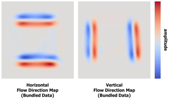 The flow direction map is implemented as two floating-point textures corresponding to horizontal and vertical components (Figure 4). In the ADEB framework (Peysakhovich et al., 2015) these textures are used only to define the edge compatibility criterion. However, the visual analysis of the flow direction map can round off the exploration of the bundled saccades traces to identify the clearly visible saccade patterns. Comparing, for instance, the maps before (Figure 1, bottom right) and after (Figure 4) applying the saccade bundling algorithm shows how the vertical and horizontal paired transitions become clearly visible. Nevertheless, while exploring two separate components can be intuitive when the flows are parallel to the components (i.e., purely vertical or horizontal, as in the square scanpath dataset), it is more trouble-some in cases of diagonal or circular flows where both components are non-null. In the scientific visualization domain a variety of methods exist that can depict a vector field in a single 2D image (Post et al., 2002). Flow visualization techniques include direct flow visualizations using arrow glyphs, geometric flow visualizations using streamlines, feature-based flow visualizations using topological information, and dense, texture-based flow visualizations using repetition of a texture according to the local flow vector (Laramee et al., 2004). The texture-based flow visualization is among the most versatile and effective methods, and is easy to implement.
