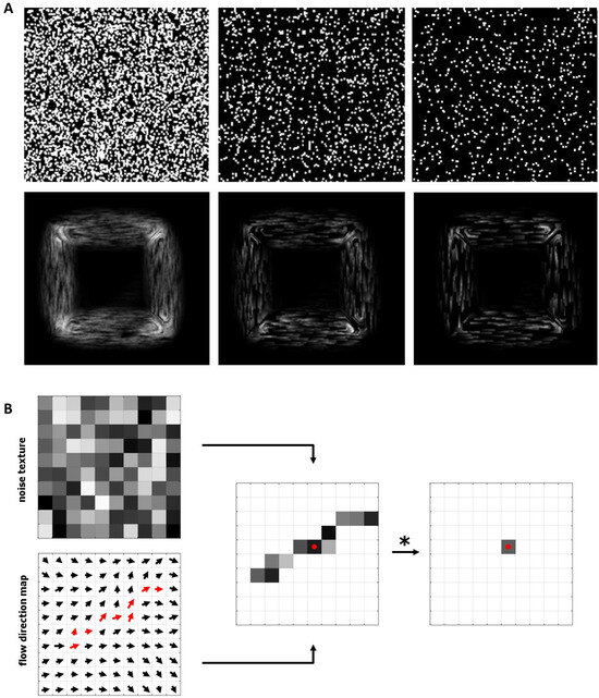 In this work, we use the Line Integral Convolution (LIC) algorithm (Cabral & Leedom, 1993) which filters an input texture along streamlines using a one-dimensional convolutional kernel (for instance, a simple constant or Gaussian kernel). Using white noise textures as an input (Figure 5A, top row), LIC visualizes vector fields where ink droplets follow the flow direction. The intensity I(x) of a pixel at location x is calculated by