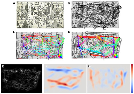 The scanpath visualization for the visual search task. (A) visual stimulus, (B) raw fixations and saccades, (C) clustered data colored with line width proportional to local density, (D) bundled data with line width proportional to local density, (E) OLIC image of the flow direction map, (F) horizontal and (G) vertical components of the flow direction map.
