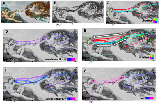 The scanpath visualization of the dataset for the Michelangelo painting. (A) visual stimulus, (B) raw fixations and saccades, (C) data bundled according to saccade direction, (D) layout “C” colored according to saccade length, (E) data bundled according to both direction and saccade length, (F) layout “E” colored according to saccade length, (G) layout “C” colored according to timestamp.