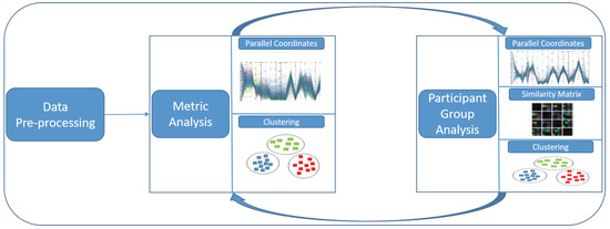 In this section, we are going to describe the used techniques as well as our visual analytics workflow model that is set up in three stages (see Figure 1): data preprocessing, metric analysis, and participant group analysis. All generated metrics, after preprocessing the raw gaze data in a first phase, are plotted as parallel coordinates. An analyst supported by various interactive techniques provided by the framework, can then explore the parallel coordinates for the ultimate goal of grouping participants. However, the visual clustering done for grouping participants in parallel coordinates is not very clear. So, the feedback provided by parallel coordinates in the metric analysis phase is used in the participant group analysis phase and vice versa. The participant group analysis phase is supported by a similarity matrix visualization based on algorithmic clustering, where metric information is used for the generation of good clusters as proposed by Kumar et al. (2016). For a matrix-based visualization, we calculate the similarity values for each pair of participants. These values are then used for clustering as well as visualization.