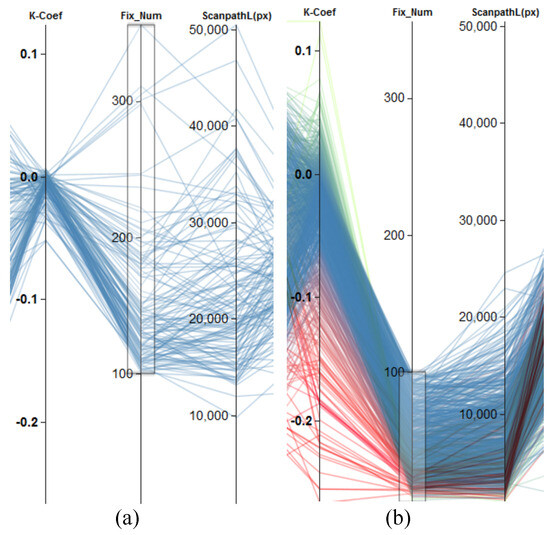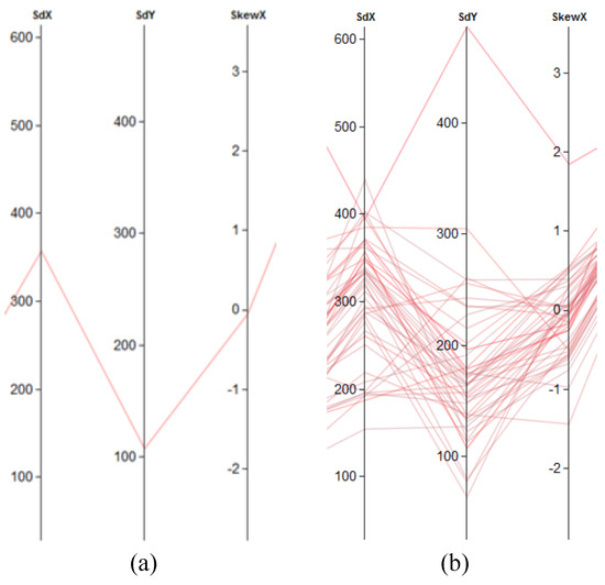 To show a lot of data dimensions, we chose parallel coordinates for visualizing eye-tracking metrics for the second part of our visual analytics workflow. Parallel coordinates made their first-time appearance in 1885 (d’Ocagne, 1885). However, they became more popular as a tool for multi-dimensional data exploration after the work of Inselberg (1985) and Wegman (1990). Parallel coordinates are based on the concept of point-line duality, where data points in Cartesian space are plotted in the form of lines in parallel coordinates. In parallel coordinates, two or more axes are plotted parallel to each other, where each axis serves as one dimension of the multidimensional data. Data points are then plotted on the parallel axes, which results into intersection of polylines at respective data values, as shown in Figure 2a. Multiple data points can be plotted similarly, as shown in Figure 2b.