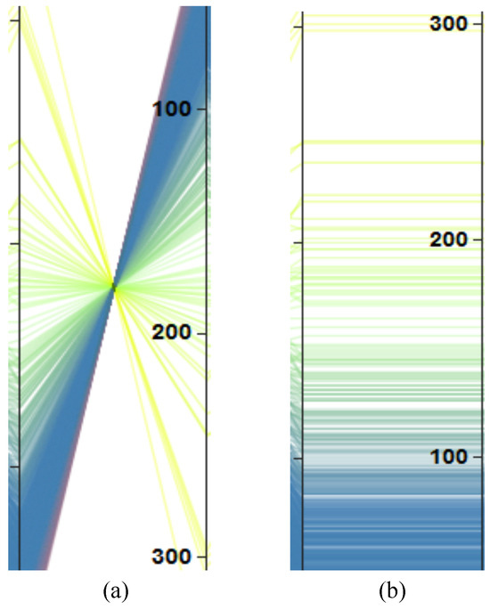 Visual patterns in parallel coordinates with (a) negative correlation and (b) positive correlation.