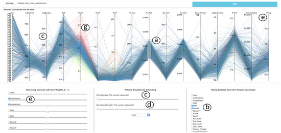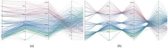 - Graham, M., and J. Kennedy. 2003. Using curves to enhance parallel coordinate visualisations. In Seventh International Conference on Information Visualization. pp. 10–16. [Google Scholar] [CrossRef]