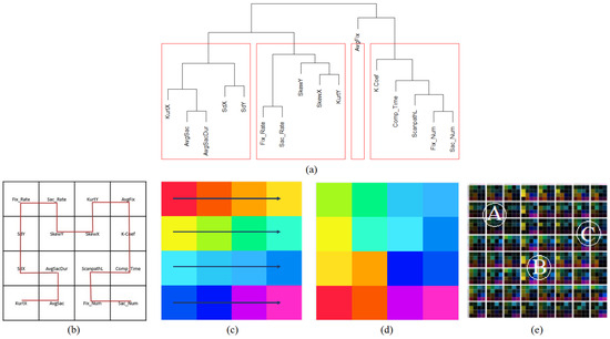 Overview of the procedure followed in the generation of Dimensionally Stacked Similarity Matrix (DSSM). The dendrogram shown in Figure (a) reveals the proximity between metrics from eye-tracking data. Figure (b) shows the order in which metrics are stacked in the similarity matrix following a second-order Hilbert curve. Figure (c) shows the 16 colors with varying hue to represent each similarity value in the sub-grid. Figure (d) shows that choosing the Hilbert curve preserves locality in colors. Figure (e) displays an example of multi-dimensional stacked metrics with dimension 8 x 8 for 8 participants.
