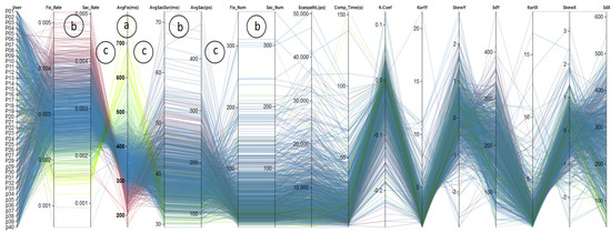 Overview of all variables in a parallel coordinates diagram. Color indicates different clusters ob-tained from clustering based on the fourth axis (AvgFix, (a)). The visualization also reveals positive correlation between attributes (b) and negative correlations (c).