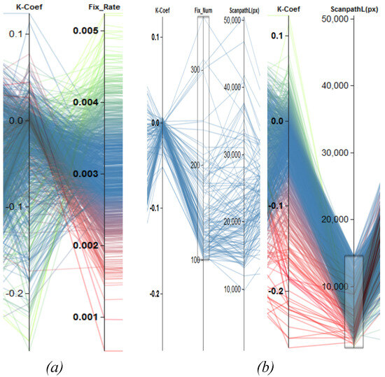 Examples of finding effects based on the clustering of a single attribute. (a) shows the negative correlation between Ҡ Coef and FixRate. (b) depicts two different groups of behavior regarding the Ҡ Coef based on scanpath length. Scanpaths longer than about 15,000 px ((b), left) lead to Ҡ Coef values centered around zero. Shorter scanpaths ((b), right) result in a broader negative distribution.
