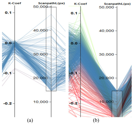 Parallel coordinates plots serve the purpose of visual exploration, as finding the relation among the eye-tracking metrics in our case. Of all the three possible correlations (positive, negative, and none), negative correlation has the most striking pattern. The intersection of data points of higher values on one axis are mapped to lower values on the neighboring axis and vice versa, resulting into an accumulation point that is easily spotted. A sample case for perfect negative correlation is shown in Figure 3a. Positive correlation shows properties opposite of negative correlation, thus resulting in straight lines, as depicted in Figure 3b.