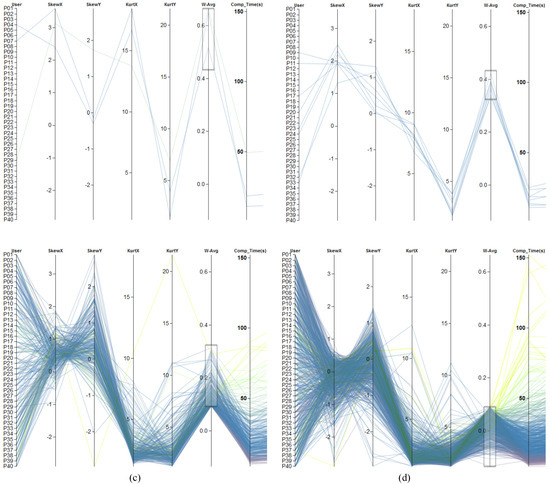 To further investigate the spatial distribution, we can include kurtosis into the analysis. Based on the skewness, we have derived rough areas where participants were looking at. The kurtosis of the distributions describes now whether there are frequent small deviations of mean values or frequent larger dispersed data. The first case would indicate the existence of focus attention areas, whereas the later a wider spread of attention on possibly multiple locations. Since we are more interested in the effects of kurtosis, this metrics got a higher weight (0.7). Skewness got lower weights (0.3). Based on the new combined metric, we could roughly separate participants into four groups. Each group shows distinct visual patterns. The first one (Figure 12a) contains only a minority of the data that shows large changes between neighboring axes. The second group (Figure 12b) exhibits a drop-off of changes from left to right. The third (Figure 12c) and fourth (Figure 12d) group show similar values for the kurtosis in both spatial directions and also for the skewness in x-direction, but differ visually in the skewness in y-direction. With this kind of analysis, using parallel coordinates, we were able to investigate characteristics of each scanpath of each participant during the Metric Analysis step of our workflow (see Figure 1) and to form clusters based on color encoding or similar visible line structures.