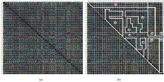 During the following Participant Group Analysis, our multi-dimensional stacking approach allows us to compare all participants to each other in much detail. Standard approaches generate therefore a similarity matrix where the columns and rows represent the participants, which are order alphanumerically. Each cell of the matrix contains a similarity value. In our case, a matrix cell contains several color-encoded elements, which correspond to the similarity values of the used metrics. An example of this is shown in Figure 13. Here, we can see some isolated group structures, but in general the visualization looks rather chaotic. By performing a reordering of the participants based on the visual inspection in parallel coordinate plots, we are able to introduce, to some degree, order into the chaos: getting similar participants spatially closer reveals more group structures than before. Figure 14a depicts the similarity matrix with reordered participants, whereas Figure 14b highlights a possible grouping. The new order of participants is the result of hierarchical clustering based on a combined metric (skewness in x- and y-direction with a weight of 0.3; kurtosis in x- and y-direction with a weight of 0.7). By using the new ordering, we identified six different groups exhibiting same visually characteristics.