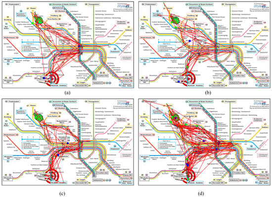 Examples of scanpaths for participants that were confronted with color-encoded metro maps. (a) shows scanpaths of participants who are contained in group (b), selected from the horizontal axis. (b) shows scanpaths of participants who are contained in group (a), selected from the horizontal axis. (c,d) show scanpaths of participants selected from the vertical axis who are included in group (a,b). Scanpaths in (c) are more similar to (a), since they are focused on a path leading from the start to the main station and then to the destination. Scanpaths in (d) are more similar to those in (b), since they are less focused on one specific path involving also areas left and right of the main station. The start location is designated with a green hand and the destination with a target symbol. The start of the scanpath is indicated by a big green dot and the end of the scanpath by a blue dot. The color of smaller fixations in between is gradually changing from green to blue encoding the temporal ordering of the fixations.