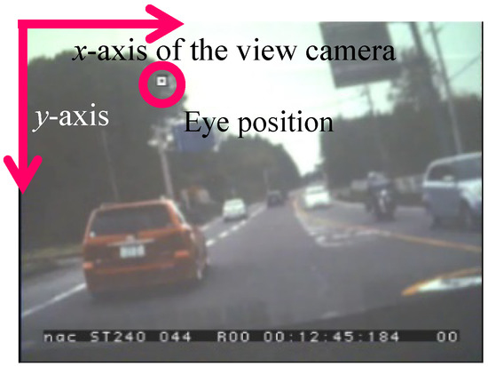 To record the data of the eye position, we selected NAC Image Technology’s EMR-9 as the eye-tracking device, which includes a view camera attached to the subject’s forehead for video recording. The eye position is indicated by the x–y coordinates in the area recorded by the view camera (Figure 3). Even if the eye position is fixed on a specific item, head movements will cause shifts in the view camera area and the x–y coordinates, leading to difficulties in identifying the target object, as seen in Figure 4.