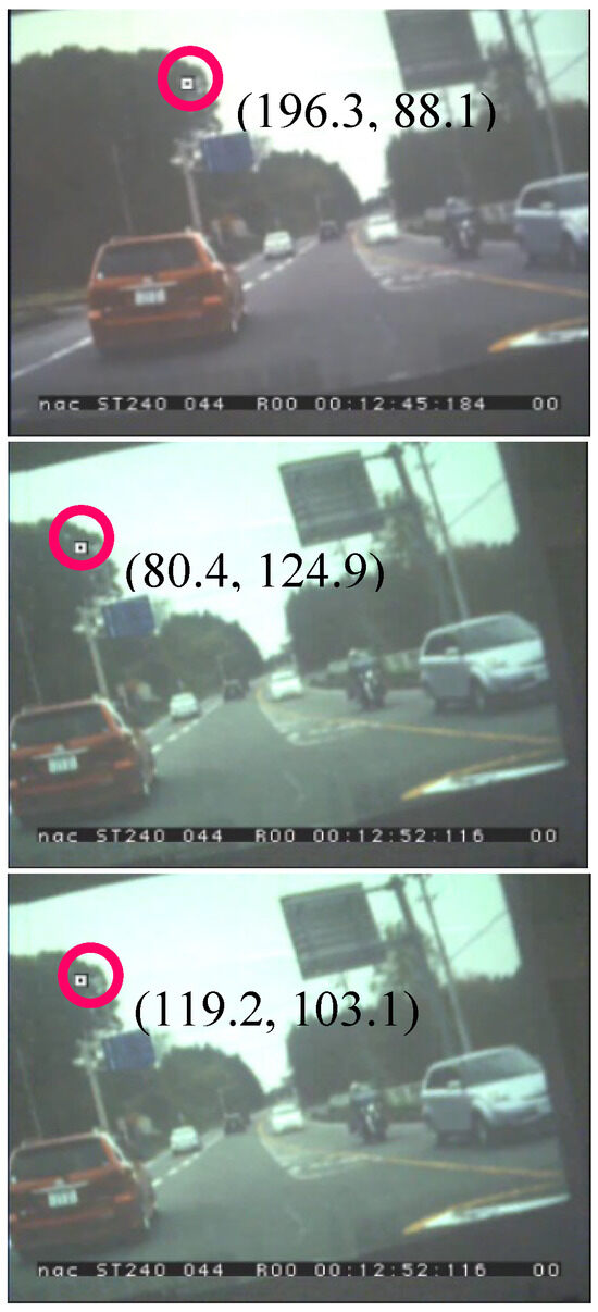 Our method can also be used for gaze measurement while watching a movie, and output the movie with eye point mapped on each frame automatically. Here, a driving video footage taken from the inside of a vehicle while driving was adopted as a visual stimulus. Figure 16 shows the images clipped from the movie and Figure 17 shows the images of view camera and the corresponding corrected eye positions mapped on the source movie.