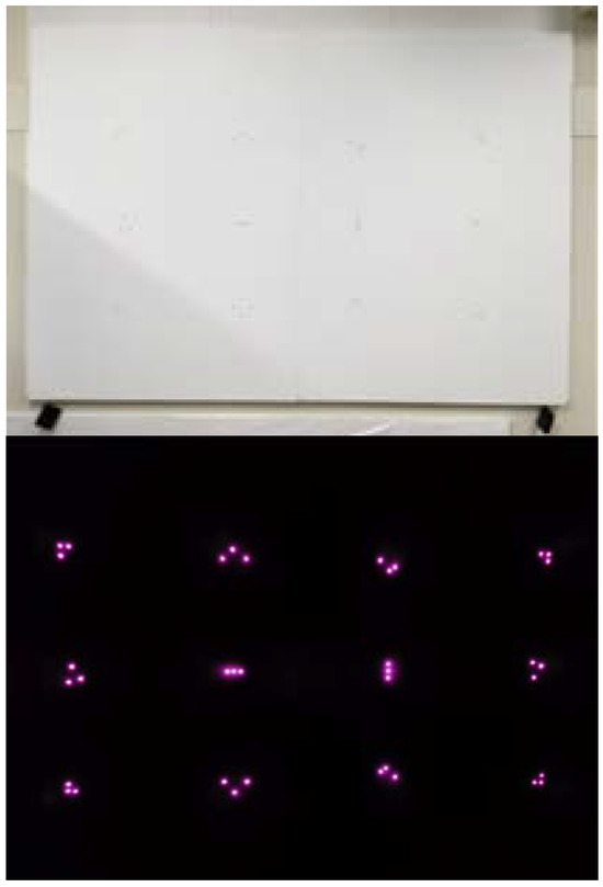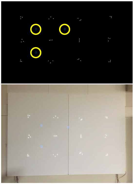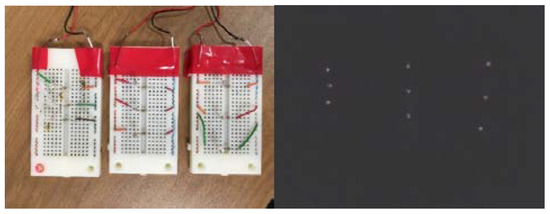 Based on the findings, several patterns were chosen and created with IR markers. Specifically, NIR-LEDs and resistors were attached to a solder-less breadboard and were mounted onto a polystyrene board. To ensure the high accuracy of the template matching, it was found that twelve patterns were required to be on the board for at least three patterns to be within the view camera at a given time for image processing. The layout of the IR markers was decided based on the similarity results seen in Table 1, and the actual implementation can be seen in Figure 7.