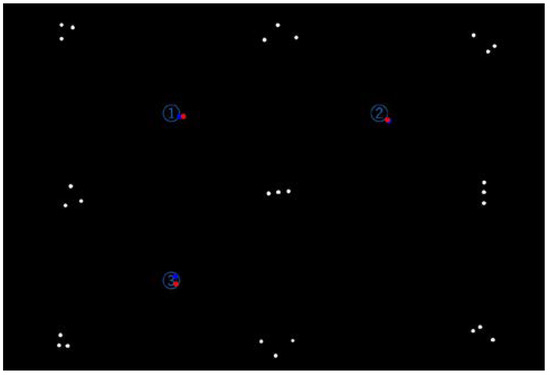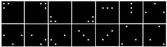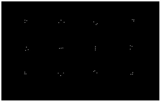 To decide on the exact patterns, the similarities between patterns of filtered IR markers (Figure 6) have been schematically calculated. Taking condition 2 into consideration, a three-point pattern was selected from a 5 × 5 dot matrix for each pattern, which was the best balance to ensure noticeable differentiation. Similarities are calculated by Hu invariant moment algorithm (Hu, 1962).