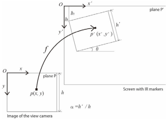 These transformations for point p(x, y) on a plane to be mapped to point p′(x′, y′) on another plane are expressed as Equation (6).