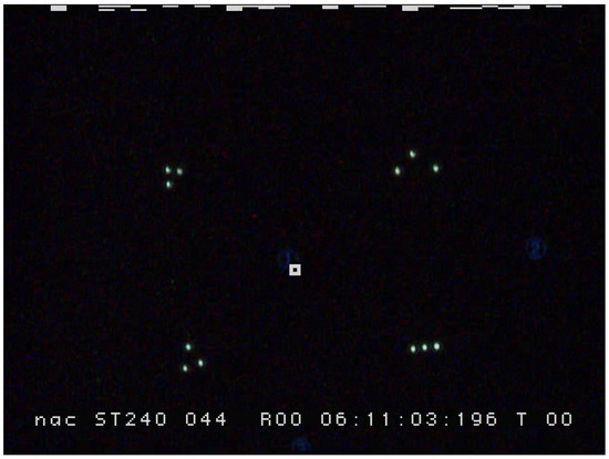 Image processing is another question that requires attention. SIFT features could be a potential option. However, these methods are not adequate for images of IR markers received through the IR filter, because single NIR-LED IR markers are homogeneous and less characteristic, as shown in the image on the right side of Figure 5. As a countermeasure, several patterns composed of multiple NIR-LEDs have been developed as matching templates, as described below. The overall flow is described later.