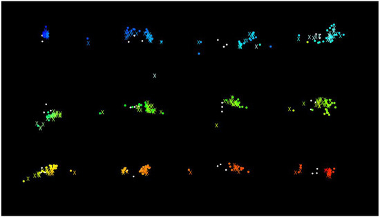 Projected image with eye position mapped (circles: results of template matching, X: results of manual mapping).