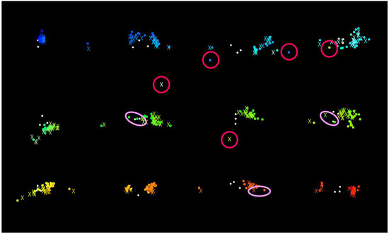 Points containing the errors of template matching (light pink: relatively large gap, dark pink: no correspondence).