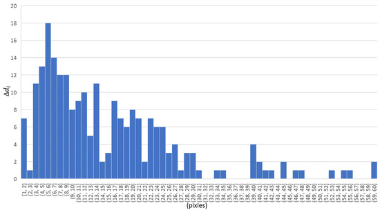 Histogram of distance between the actual eye position and the corrected eye position (∆di).