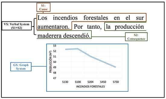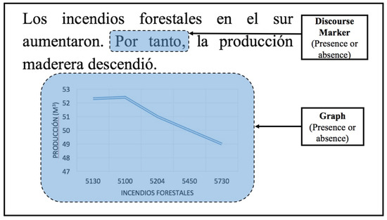 As for the limitations of this paper, in future research, we should move, on the one hand, beyond synonymic relations between words and graph. A more demanding and probably diverse data could be explored studying multiple relations between systems, such as antonym or more specifically what we could call ‘complementarity’: a multisemiotic relation in which a graph would add crucial exclusive information to the words forcing the reader to critically integrate both representational systems in order to construct a unified coherent mental representation of the whole text. On the other hand, this study focuses in cause-consequence content relations marked by the Spanish connective por tanto in which the related segments present an inverse negative relation. The effects of other types of causal relations and of other connectives on multimodal processing should be investigated in the future, as well as the effects of other types of causal relations and of other connectives, also those that require a different order of the cause and consequence segments.