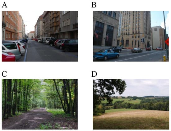 Images. All images used in this study were taken by one of the authors using a digital camera (Nikon D90) with a wide-angle zoom lens. They were composed of images of cities or natural scenery (see Figure 1). All images were transformed to 1152 × 768 pixel resolution using the Adobe Photoshop CS 6 software. Each image was individually optimized. The images had their brightness levels and contrast balanced using the “Auto Levels”, “Auto Contrast”, and “Auto Colors” options in Adobe Photoshop. Twelve images were photographs from cities in the Czech Republic (Beroun, Chlumec nad Cidlinou, Prague, Uherský Brod), Belgium (Brussels) and the United States (Seattle). The urban scenes had a diverse character. Some of them contained high-rise buildings (Seattle), whereas others were streets with typical urban buildings from the 19th century (Brussels, Prague) or streets with low-rise buildings typical of small towns (Beroun, Chlumec nad Cidlinou). The next 12 images with natural scenes were taken in the Czech Republic. They consisted of conifer or deciduous forests, meadows, or ponds. There were no people in any of these images.