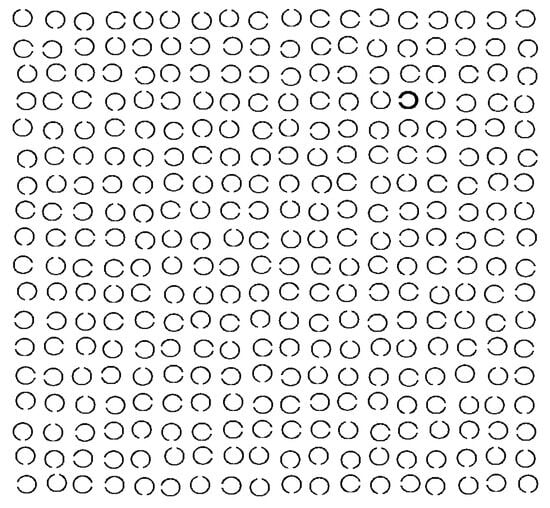 Sequential scanning task. The task included 50 trials, arranged in 5 blocks with 10 trials each. The number of trials differed from the reading task to adjust for the processing time between tasks. For every trial, a different sequential scanning display was generated beforehand. The visual display consisted of an 18 × 18 grid containing black Landolt Csij (i = horizontal position, j = vertical position) on a white background, with a line width of 0.08°, and an opening (gap size: 0.08) at one of the four positions: left, right, top, bottom (see Figure 1 for an example array). Symbols had a diameter of 0.88°. Average horizontal and vertical distance between stimulus elements was 1.32° (measured center to center). The position of Landolt Cs varied horizontally and vertically around the grid centers. This spatial jitter corresponded to one eighth of the size of a Landolt C (±0.11°). Line thickness of the start symbol was doubled. The end symbol was defined by a closed ring without a gap. Sequence length of the visual scan path was 50 to 60 symbols in each scanning display.
