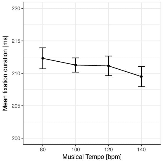 For a summary of the detailed statistics of the scanning task analyses, please see Table 3. All ANOVAs were far from significant, that is, tempo did not have an obvious effect on fixation durations, gaze durations, total scanning times, or task completion times. In addition, musical presence did not show any effect as well. In line with this, Bayes factor analyses provided weak or substantial evidence in support of the null hypotheses (absence of a linear trend of tempo and no effect of music presence; all BF10 < 1). Most importantly, the Bayes factor for mean fixation durations provided substantial evidence against a linear trend (BF10 = .18) (see Figure 3).