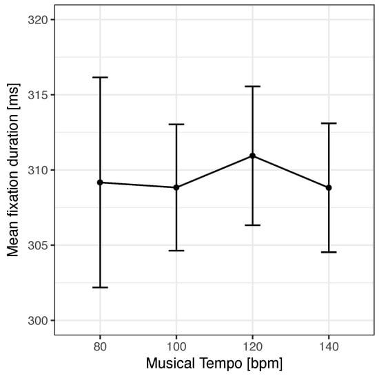 Mean fixation duration as a function of the tempo of the auditory beat. No significant effect was observed. Error bars show confidence intervals based on Cousineau (2005) and Morey (2008).