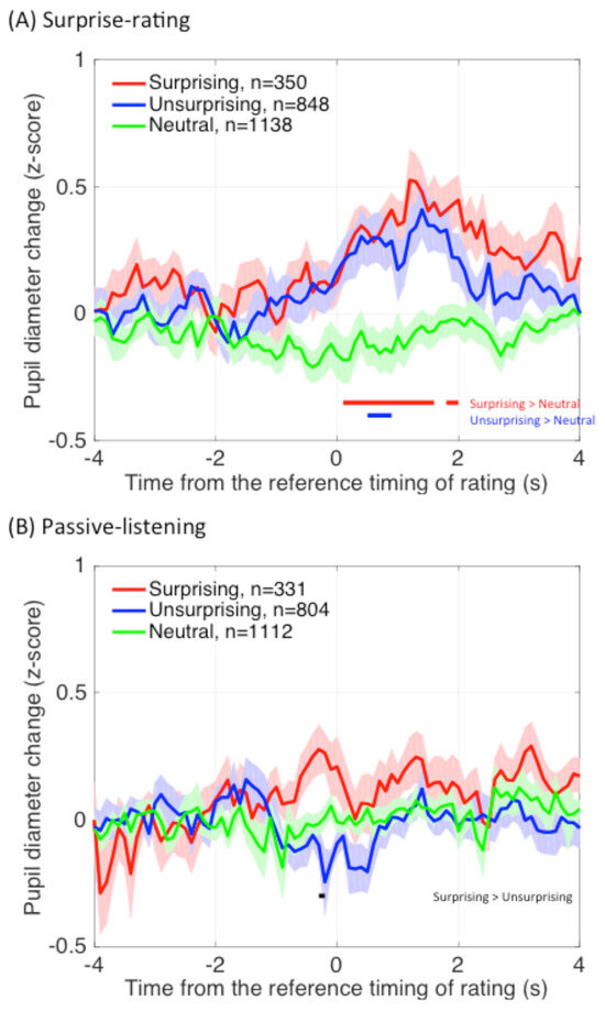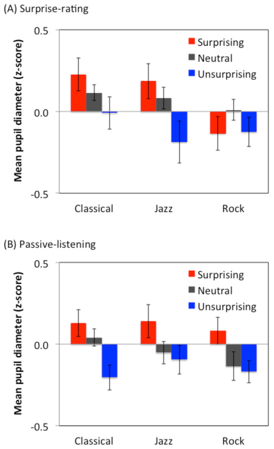 The surprise-related PDR in music cannot be explained by an explicit or spontaneous surprise evaluation of the music or cognitive processing load (in terms of task demand). Einhäuser and colleagues (2010) showed that the pupil dilates at the moment a decision is made, regardless of the decision content or whether the motor response is required. This is consistent with our observation of the decision-making-related PDR only in the surprise-rating condition, regardless of the surprising or unsurprising rating, but not in the passive-listening condition. In contrast, surprise-related PDRs were constantly observed in both conditions, and thus cannot be explained by the decision-making process. With regard to the cognitive processing load, the pupil dilates when the load increases (Beatty, 1982; Hyönä et al., 1995; Kahneman, 1973). In the current study, the task demand was constantly required during the surprise-rating session but not required at all during the passive-listening one, but the surprise-related PDR was constantly observed regardless of whether the cognitive effort was involved or not.
