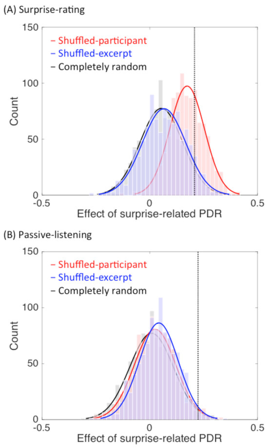 Further bootstrapping analysis demonstrated that the effect of stimulus characteristics might contribute to the surprise-related PDRs during the surprise rating task but not during passive listening. Moreover, the decision-making-related PDRs were only observed when the participants performed the rating task but not when they listened to the music passively, indicating the absence of spontaneous evaluation in the latter case. The overall results indicate that PDR reflects surprising moments in music, regardless of whether an evaluation of the surprise per se is required. This suggests that the surprise-related PDR could be due to a stimulus-driven response to the acoustic features embedded in the music or due to automatic monitoring of surprise in an auditory environment.