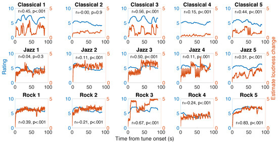 To examine the consensus among the participants on the surprise rating, we calculated Kendall’s coefficient of concordance (W). The rating data were resampled with a 10-Hz sampling rate for the analysis. The results are shown in Table 2 (sixth column). The consensuses among the participants were moderate but significant, and they varied among musical excerpts (median of 0.56, min of 0.30, max of 0.73; all ps < .001).