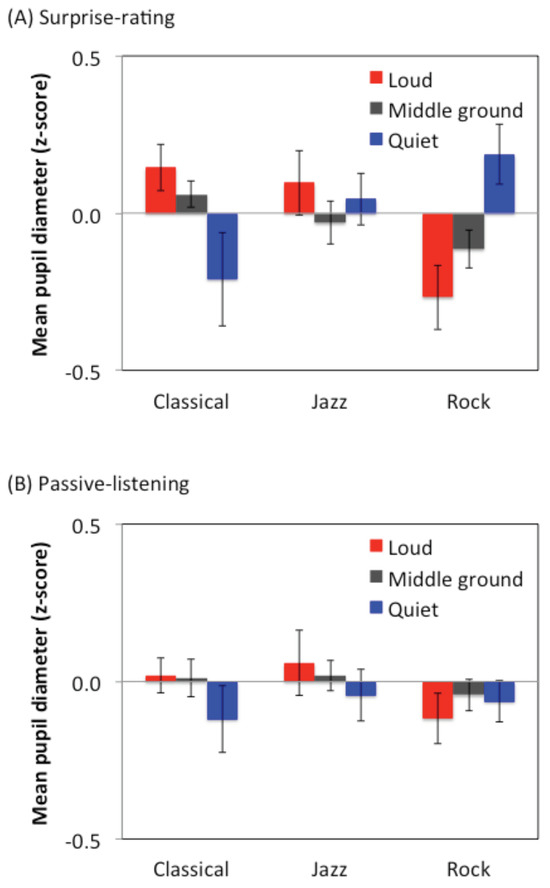 The surprise-related PDR might be partially explained by the loudness change of the music, depending on the music genre. It has been shown that subjective salience evaluation is highly correlated with loudness, regardless of whether the sound is presented briefly (Liao, Kidani, et al., 2016) or if it is long-lasting music as in the current study. However, the loudness change could not explain the pupillary response to all the music genres. In the loudness-related PDR analysis, larger pupil size during loud moments than during quiet ones was only observed for the classical music, and the effect was more remarkable during the surprise-rating condition than the passive-listening condition. This general pattern is different from the surprise-related PDR, in that the effect was observed for all the music genre. Furthermore, while the consensus of the surprise rating among the participants was at the inter-mediate level, it is possible that the pupillary response for individual participant did not simply reflect the loudness change, but instead was modulated by each participant’s specific judgment of surprise. The overall results suggest that loudness may partially explain the surprise-related PDR.