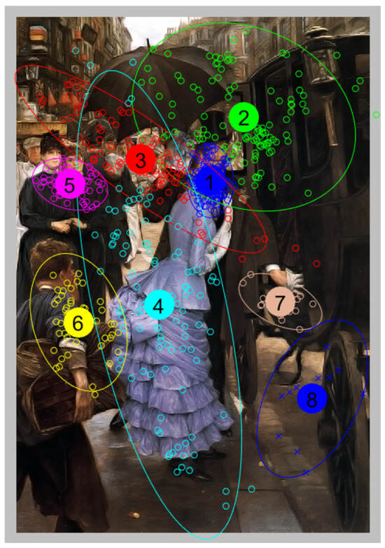 Bishop, 2006). The method of specifying the clusters has significant influence on further steps in quantitative description of a cluster. For example cluster #1 can be easily interpreted as being associated with a natural concentration of attention on woman’s face. Similarly, cluster #7 (brown) can be interpreted as associated with a concentration of attention on man’s hand. EM method takes into account statistical dependencies in the distribution of fixations and, to a large extent, allows the specification of clusters, which can be interpreted semantically. Very good results of implementation of mixtures of normal distributions can be obtained for clusters of elliptical shape. It was also found that the result of grouping using the EM algorithm is sensitive to the initial