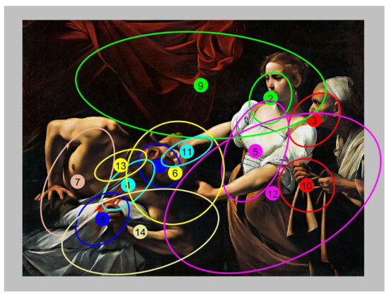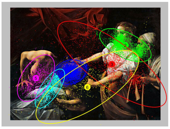 Figure 6), clusters could be interpreted as representative ROIs. Thus, the clusters #1, #2, and #3 can be interpreted as the ROI associated with the faces of individual characters. Cluster #4 is associated with a sword and so on. For greater clarity,