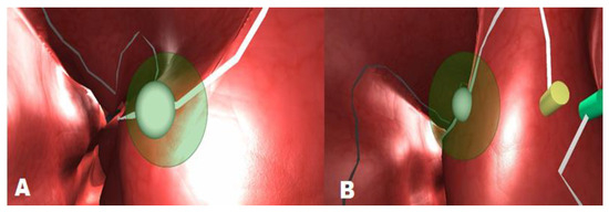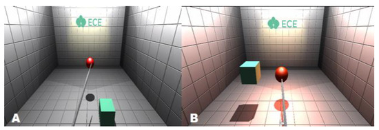 In Scenario-1, it is necessary to catch the red ball (Figure 1: A) that appears at random places in a room with a surgical tool. After catching the red ball the aim is placing it on the cube, which also appears at random places (Figure 1: B). This scenario is a general simulation model aimed to gain the ability to use the surgical instrument and to develop depth perception and the process has to be completed 10 times in a given fixed period of time.
