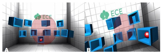 In Scenario-3, the aim is to approach to the red ball with the correct angle and explode it in a given fixed period of time. This ball appears 10 times in different cubes randomly (Figure 3: A & B). If the correct angle is achieved, the ball will explode; otherwise it will not. In this scenario the aim is to develop depth perceptions and improve ability to approach a certain point with the correct angle. This scenario is a simulation of a general model.