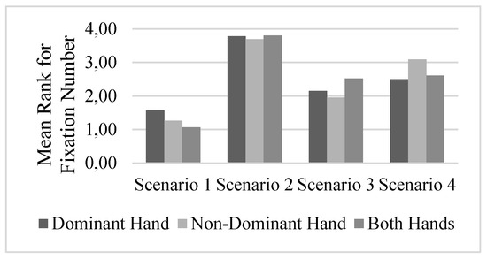 - In the dominant hand condition, Scenario-1 has the lowest mean rank for the fixation number (1.47) and fixation duration (1.04) while Scenario-2 has the highest mean rank for the fixation number (3.78) and fixation duration (3.70).