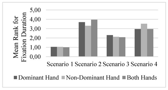 - When using both hands, Scenario-1 has the lowest mean rank for the fixation number (1.07) and fixation duration (1.00), whereas Scenario-2 has the highest mean rank for fixation number (3.80) and fixation duration (3.96).